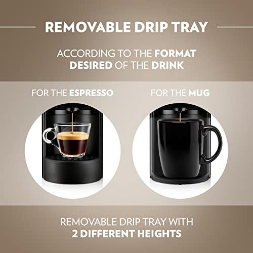 Adjustable cup rack height in two heights Ready time about 25 seconds Elegant Italian design Used capsules drawer capacity 4/5 coffee capsules