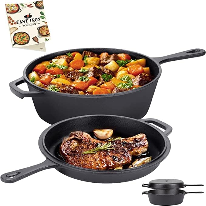 Overmont Pre-Seasoned 3L/3.2 quart Cast Iron Combo Cooker with Lid,2 in 1 with Cookbook Recipe,3L Dutch Oven, 1.4L Skillet, Grill Griddle Works on Baking,Camping,Stovetop & in Oven